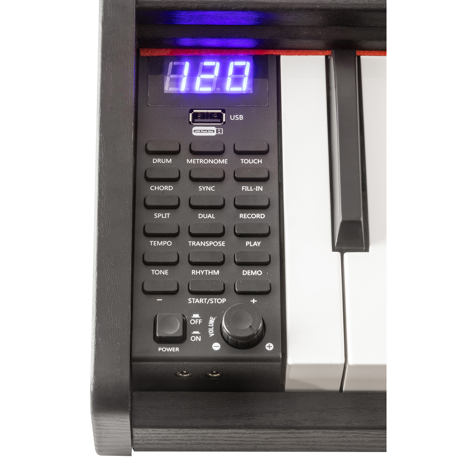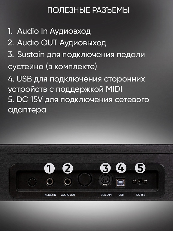 USB порт, аудиовход/аудиовыход, два разъема для наушников, разъем для подключения педали