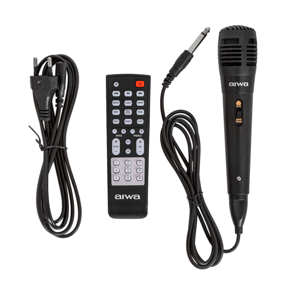 в комплекте пульт ДУ и проводной микрофон