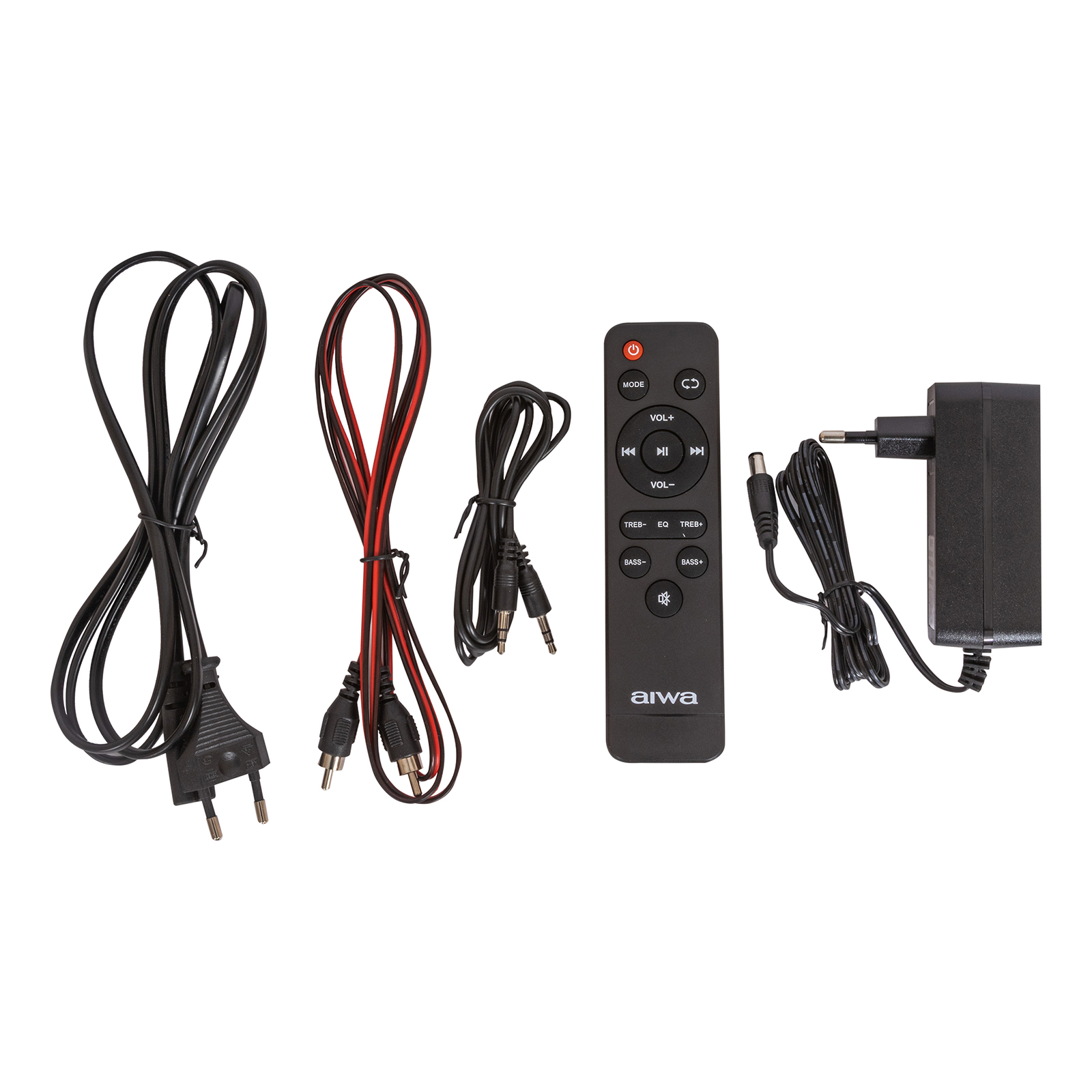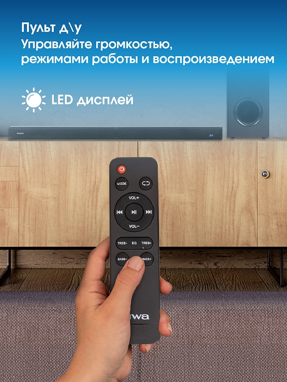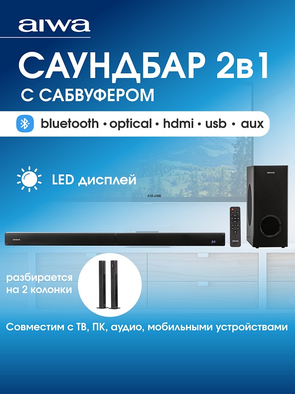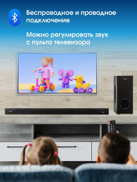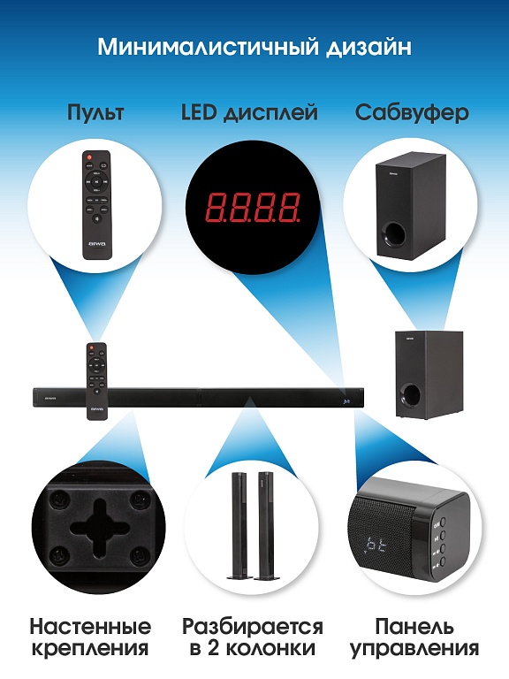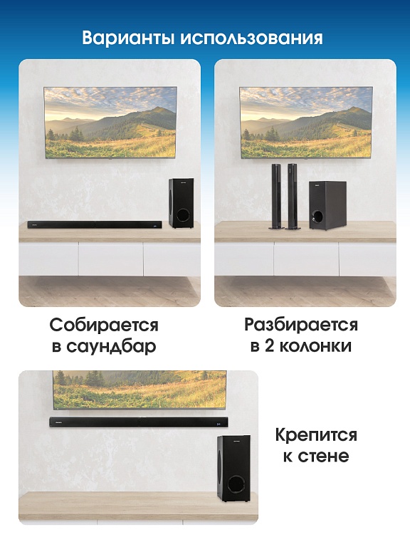 звуковая панель, адаптер питания, сабвуфер, шнур питания сабвуфера, подставки для установки частей саундбара в вертикальном положении – 2 шт., аудиокабель, межблочный соединительный кабель, пульт ДУ, руководство по эксплуатации, гарантийный талон